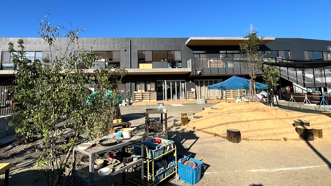 砂場では山や川を作りながら夢中で遊び、創造力や協調性を育んでいます。砂場は子どもたちにとって大切な「学びの場」です。今後は園庭に木や花を植え、築山やビオトープの設置も予定しており、現在着工中です。